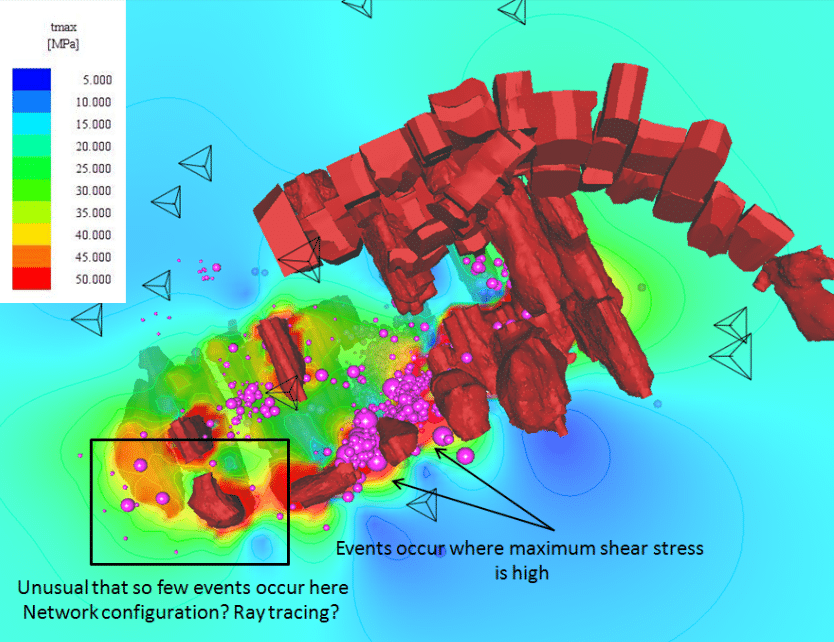 Seismicity, modelled stresses and/or other data can be visualised as points, vectors, contours and isosurfaces. Visualisation combined with full 3D navigation and interaction provides a holistic view of what is happening on the mine. Types of interactions: