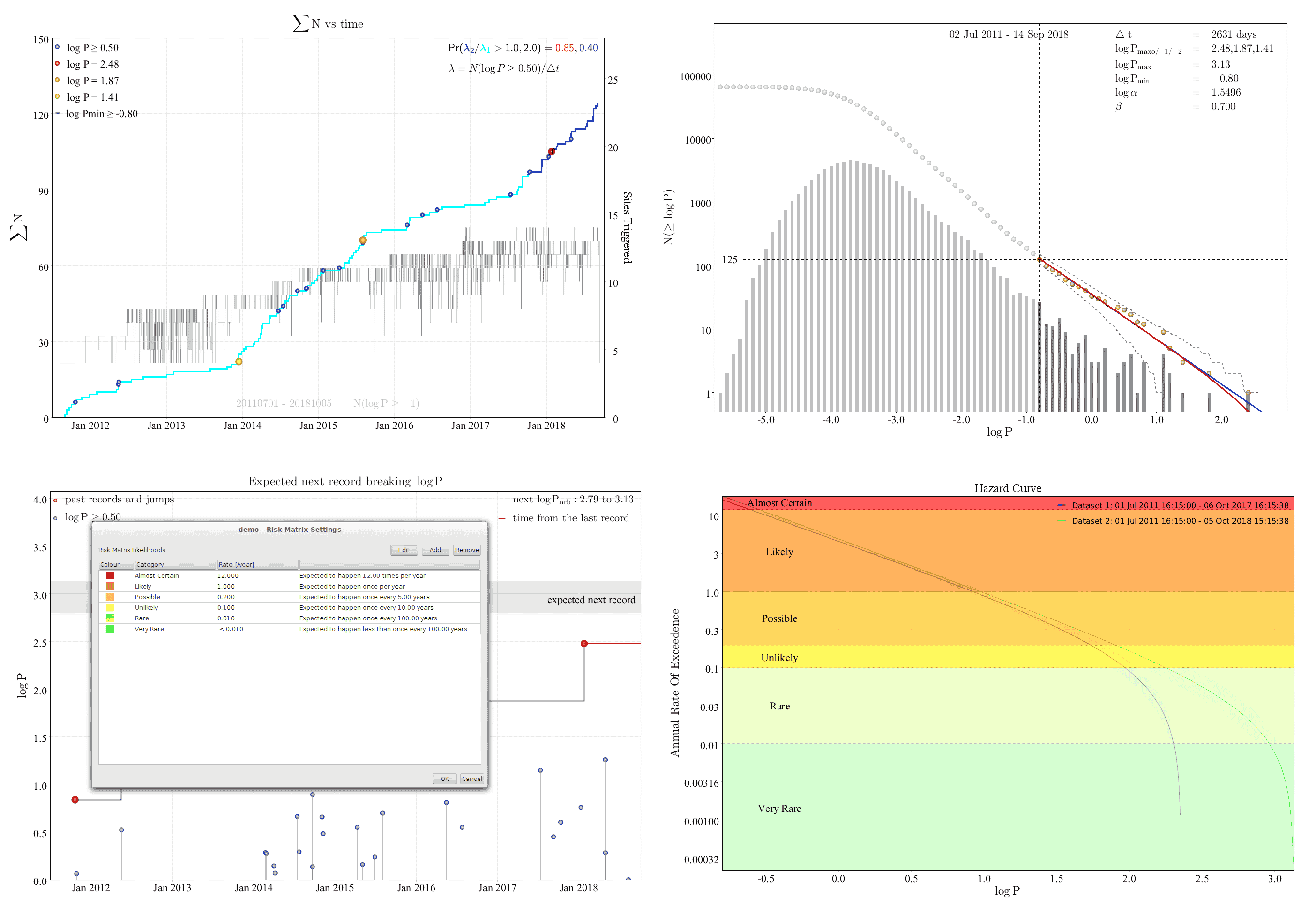 The likelihoods of potentially damaging seismic events or ground motion can be assessed using the methods described in the MSRB. Example of assessment of seismic hazard for a seismogenic region (size distribution hazard). It includes the evaluation of the next record breaking event in terms of seismic potency P and estimation of parameters of potency-frequency distribution. The resulting hazard curve is presented using the likelihoods of Risk Assessment Matrix established at the mine.
